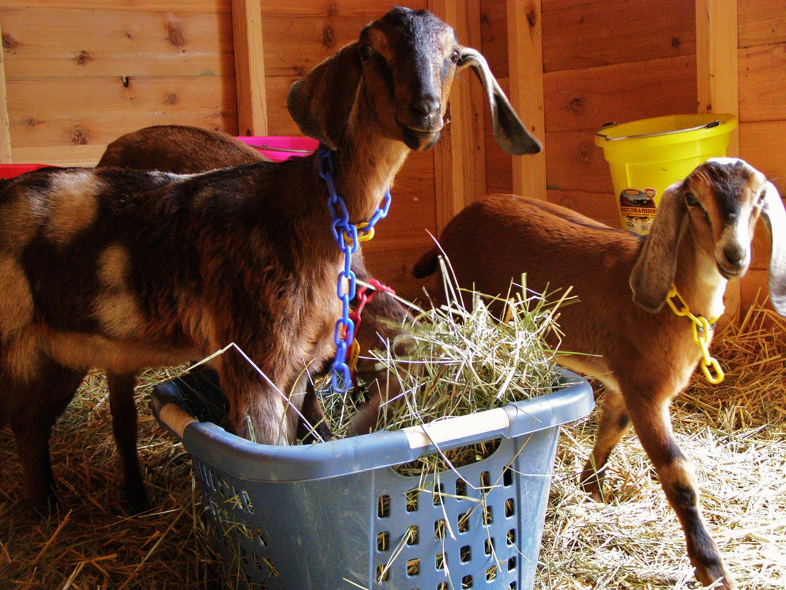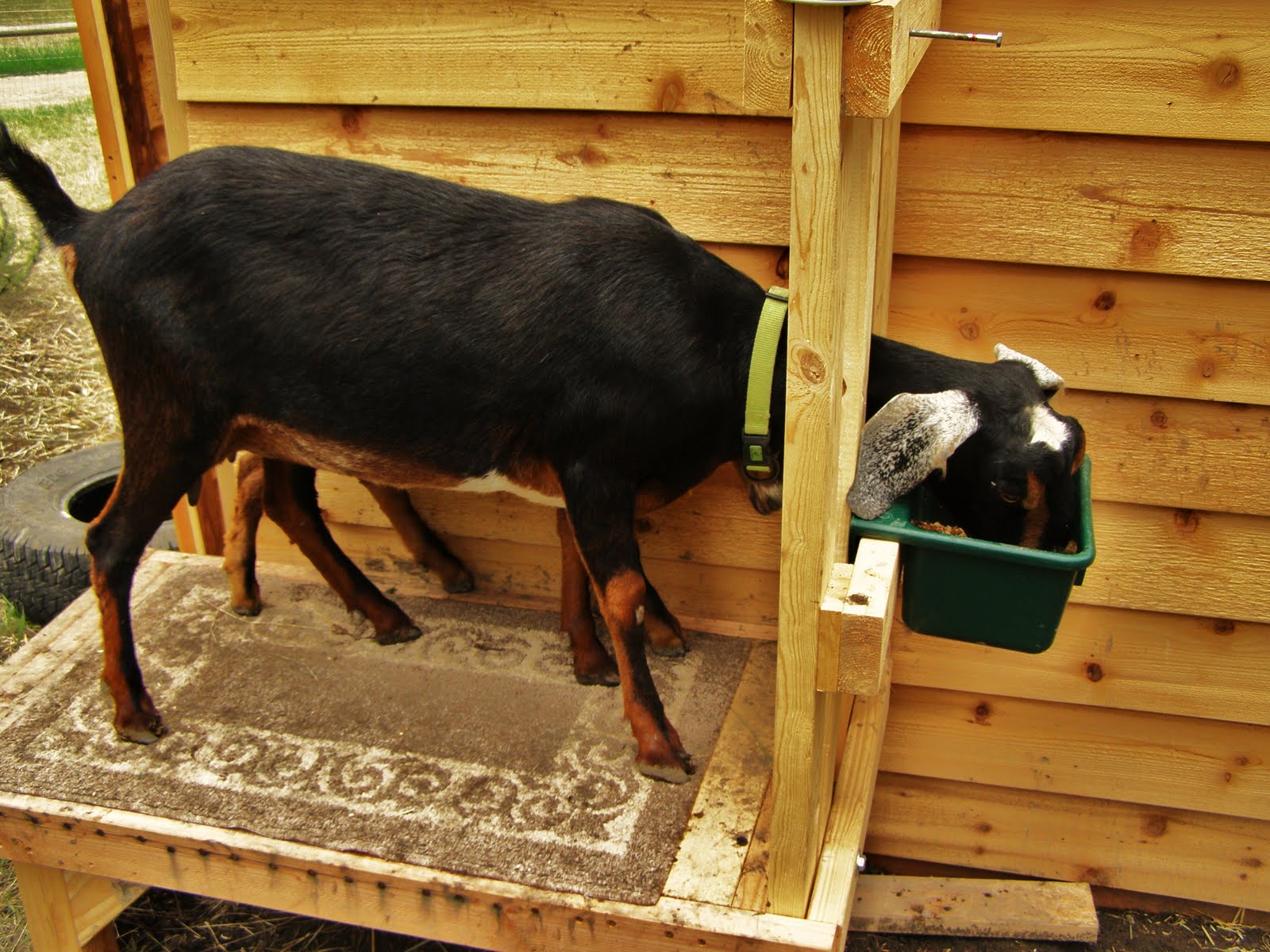The farmer can then slide one of the vertical slats of wood over to fit snugly beside the doe’s neck and “lock” it closed using a long screw and some choicely placed holes drilled into the wood beforehand. The doe is still able to eat (and kick, mind you) but is unable to pull her head (due to adorably enormous ears) back out of the stanchion until you unlock her.