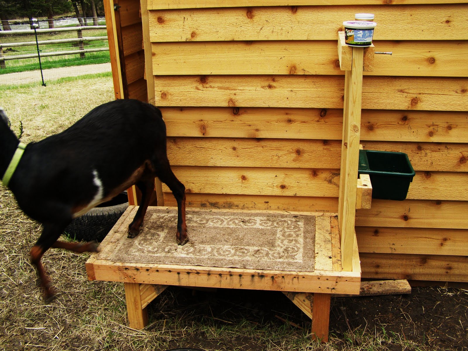 You can also see the ghetto climbing sculpture I put together for the energetic buckling to bounce around on (which he does, frequently and exuberantly, it’s hysterical). It is made from Hattie’s old Dog loo, a bunch of old tires, and some cinder blocks! Goats love to climb by nature, so anything tall, and strategically placed far from fences gets the job done.