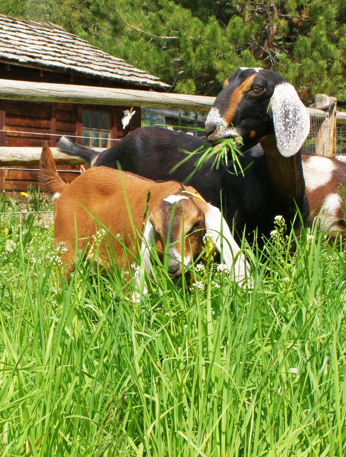 Here is a good view of the pasture these goats spend their lazy days inside of now. On the left is the driveway and on the right and back side is Jack Creek. This pasture is fenced in using a mobile electric fence powered by solar. LOVE IT!