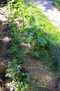 Weeds? I'm not a big weed puller (Ed can attest to this). I would rather gnaw my own arm off in fact. This year I threw down clean straw between my rows of plants to cut down on random crap sprouting. It seems to be working. Not only this, but it holds in moisture nicely.
