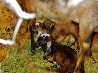 The two 5-day-old doelings are doing really great, by the way, happily pouncing, running, and bleating their way through the day. Completely indifferent to the snow we recently experienced, I finally decided to take their fancy sweaters off today. I decided to name them Flo and Pinkie, and will post recent Flo and Pinkie photos soon!